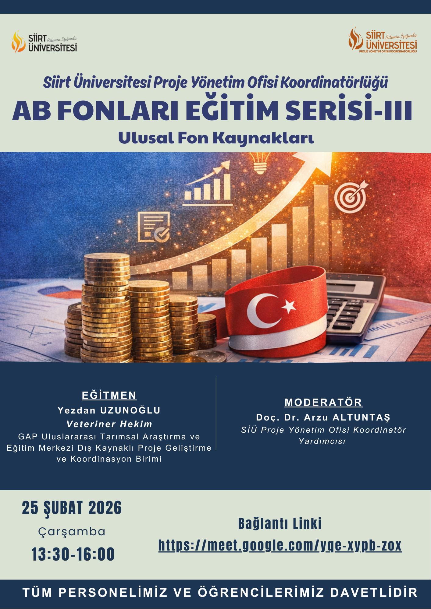 Koordinatör Yardımcımız Doç. Dr. Arzu ALTUNTAŞ'ın moderatörlüğünde 25.02.2026 Çarşamba günü 13:30-16:00 saatleri arasında çevrimiçi "AB Fonları Eğitim Serisi-III: Ulusal Fon Kaynakları" isimli eğitim verilecektir. Eğitime GAP Uluslararası Tarımsal Araştırma ve Eğitim Merkezi Dış Kaynaklı Proje Geliştirme ve Koordinasyon Birimi'nden Yezdan UZUNOĞLU (Veteriner Hekim) eğitmen olarak katılacaktır.